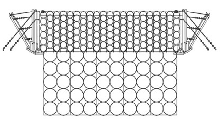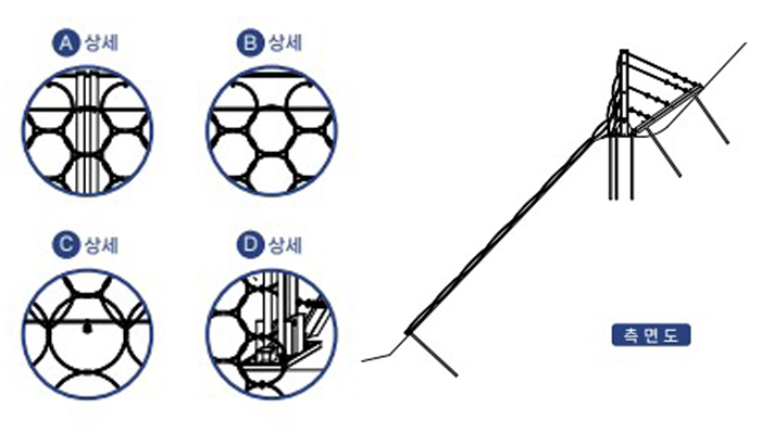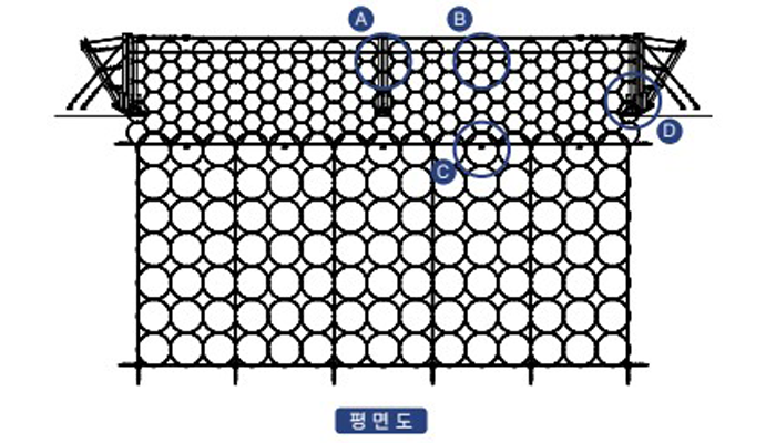 교차 지점마다 패럴(parallel) 부재를 활용해 결속. 외력에 의한 슬립장지 및 망의 변형 최소화.